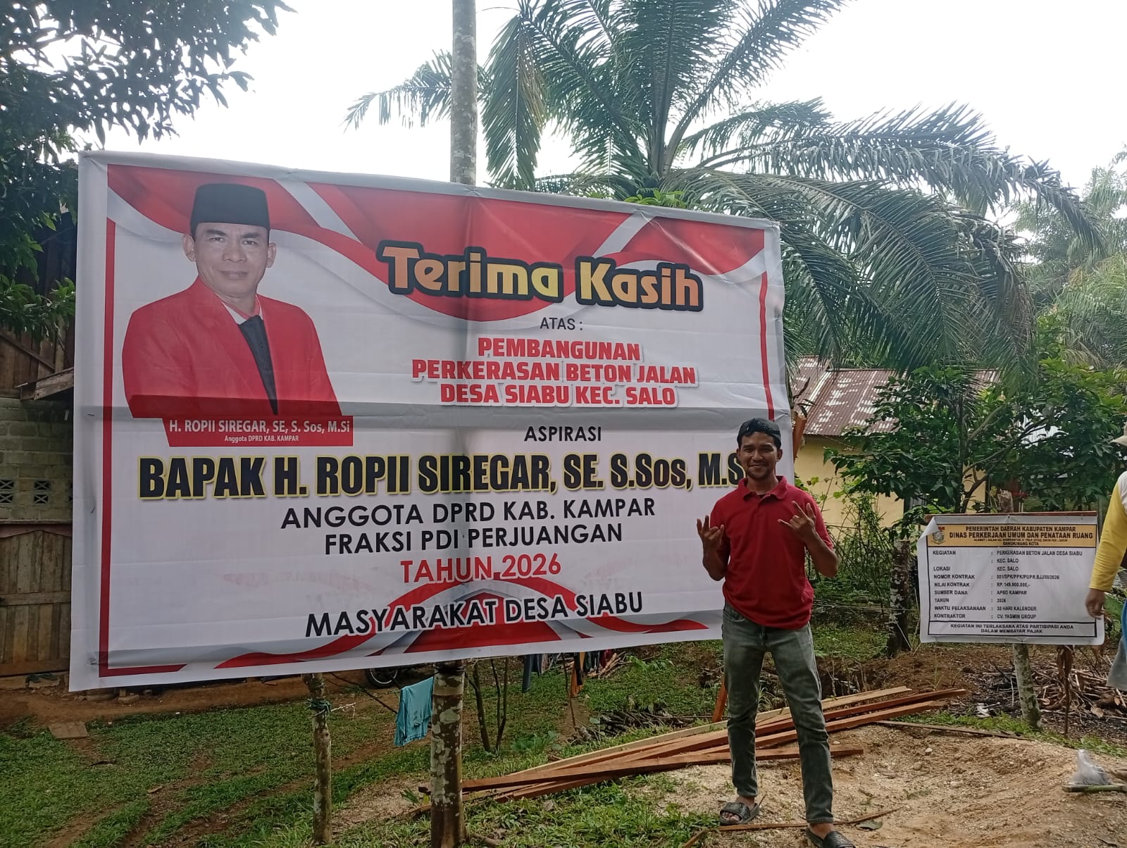 KAMPAR – Pembangunan infrastruktur jalan di wilayah Kecamatan Salo, Kabupaten Kampar, mendapat respons positif dari masyarakat. Sejumlah baliho berukuran besar berisi ucapan terima kasih kepada anggota DPRD Kabupaten Kampar, Ropii Siregar, tampak terpasang di Desa Salo dan Desa Siabu, Selasa (14/04/2026).